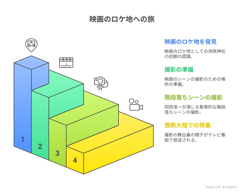 神社の急な石段や鳥居、境内の自然に囲まれた構造が、侍たちの死闘を映像としてリアルに表現するのに最適な場所として選ばれたのです。