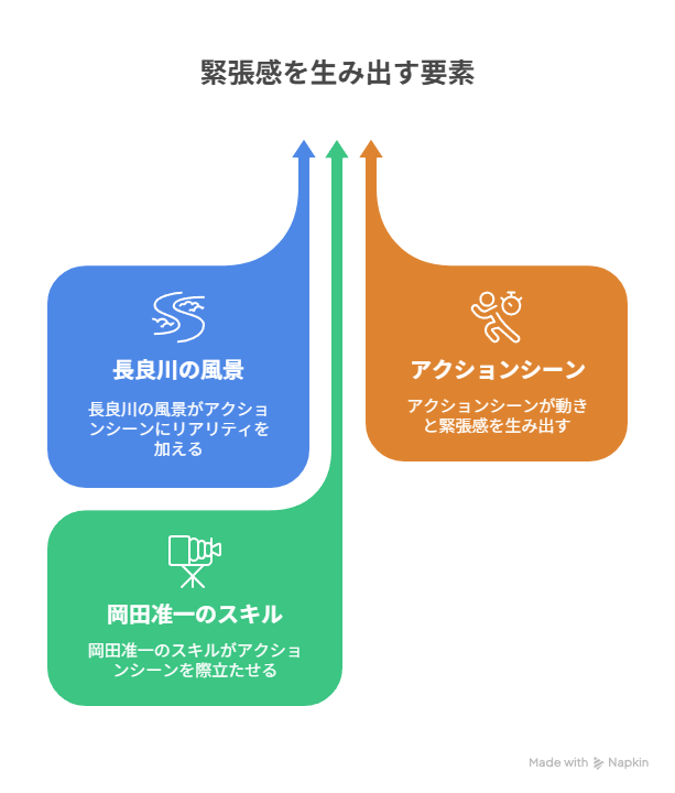 川の流れや岸辺の起伏がアクションシーンに動きとリアリティを加え、視聴者に強い緊張感を与えます。