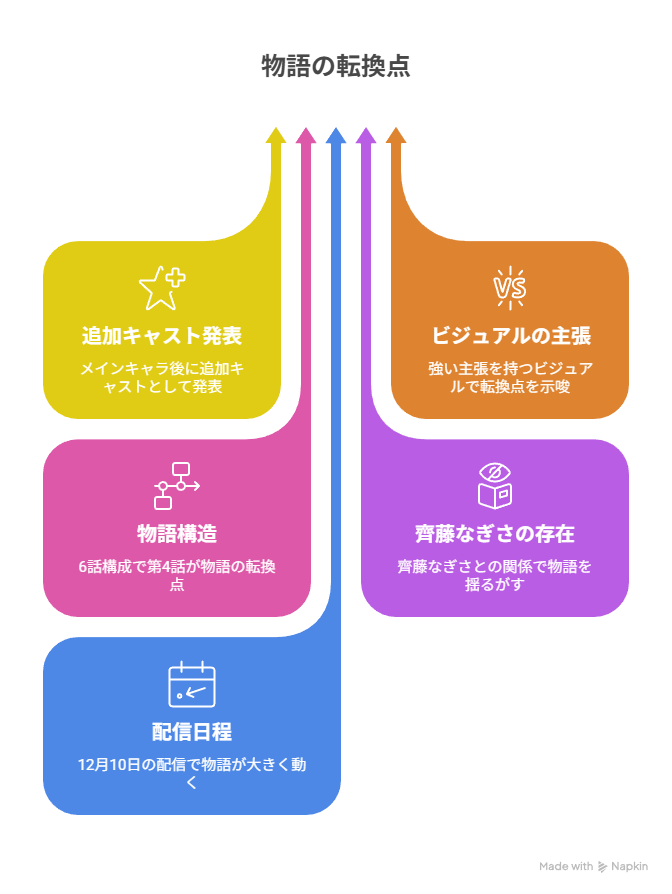 全6話構成の物語設計、相関図での立ち位置、そして公開ビジュアルが示すキャラクター性を組み合わせると、「第4話登場」がもっとも論理的な選択になるからです。