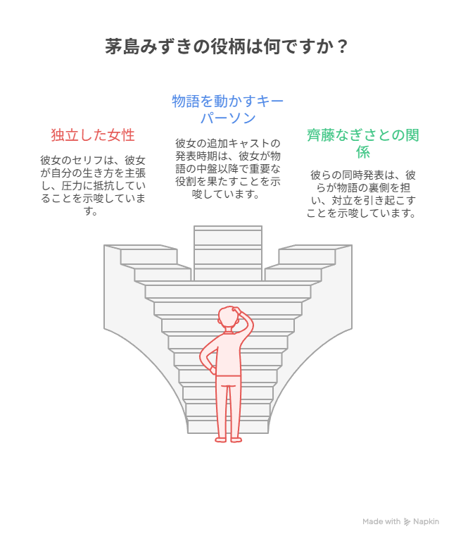 ビジュアルの強さ、追加キャストの発表時期、そして齊藤なぎささんとの同時発表という3つの観点を踏まえると、茅島みずきさんの役柄は物語の中心へ深く入り込み、視聴者の価値観を揺さぶる人物として描かれる可能性が非常に高いと言えます。