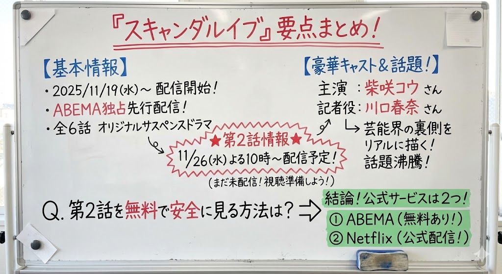 このように、『スキャンダルイブ』第2話の地上波再放送は予定されていませんが、ABEMAとNetflixを活用することで確実に視聴が可能です。