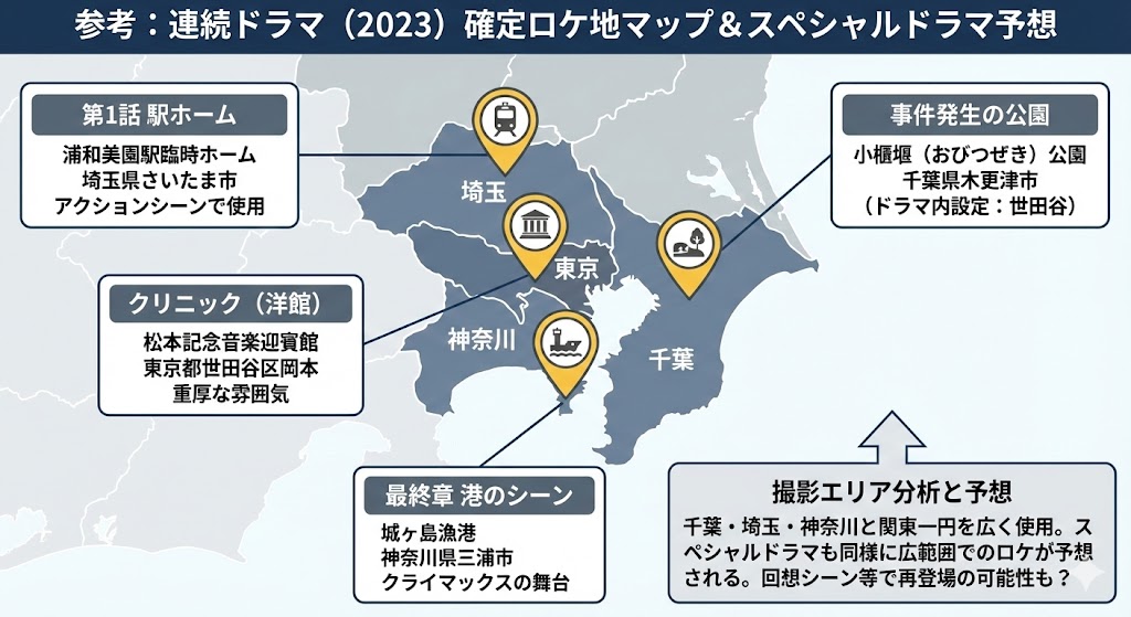 こうして見ると、千葉、埼玉、神奈川と、関東一円を広く使って撮影されていることが分かります。今回のスペシャルドラマでも、同様に東京周辺の広い範囲でロケが行われていると予想されます。