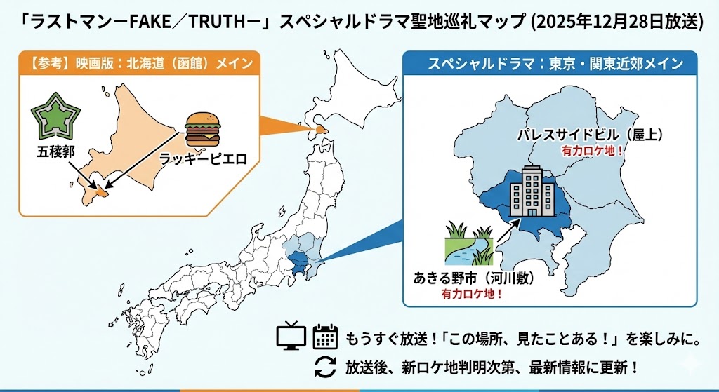 2025年12月28日放送のスペシャルドラマ「ラストマン-FAKE/TRUTH-」のロケ地情報について解説しました。