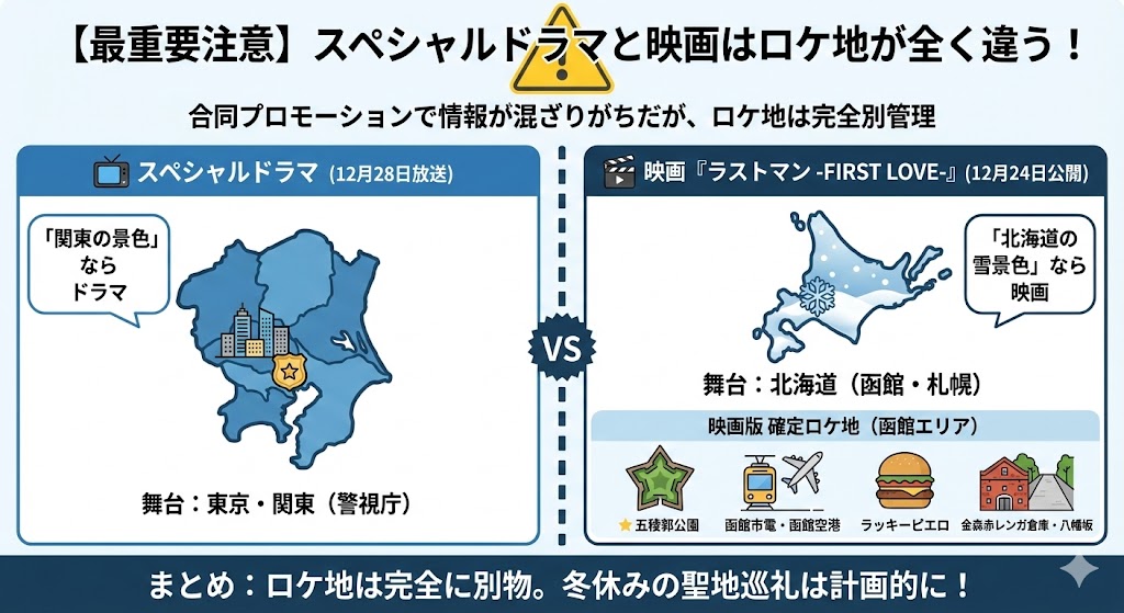 ドラマと映画は合同プロモーションを行っているため情報が混ざりやすいですが、ロケ地については完全に別管理されています。