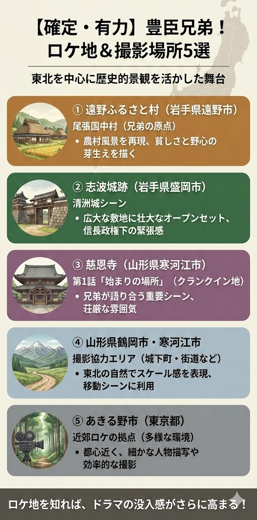 2026年大河ドラマ『豊臣兄弟!』のロケ地は、Xでの情報やロケ地情報サイト、自治体の撮影協力実績などから、かなり具体的に見えてきています。