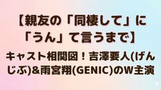 親友の「同棲して」に「うん」て言うまで 【親友の「同棲して」に「うん」て言うまで】』キャスト相関図!吉澤要人(げんじぶ)&雨宮翔(GENIC)のW主演】 2026年1月スタートの冬ドラマの中で、BL(ボーイズラブ)ファンだけでなく、アイドルファンからも熱い視線が注がれている注目作があります。その名は『親友の「同棲して」に「うん」て言うまで』。人気BLコミックの実写化である本作は、タイトル通り... 2025.12.07 親友の「同棲して」に「うん」て言うまで